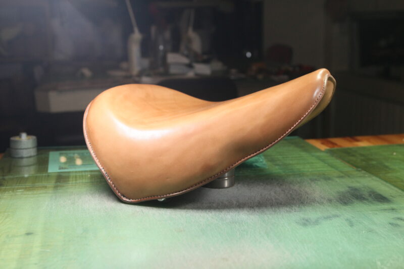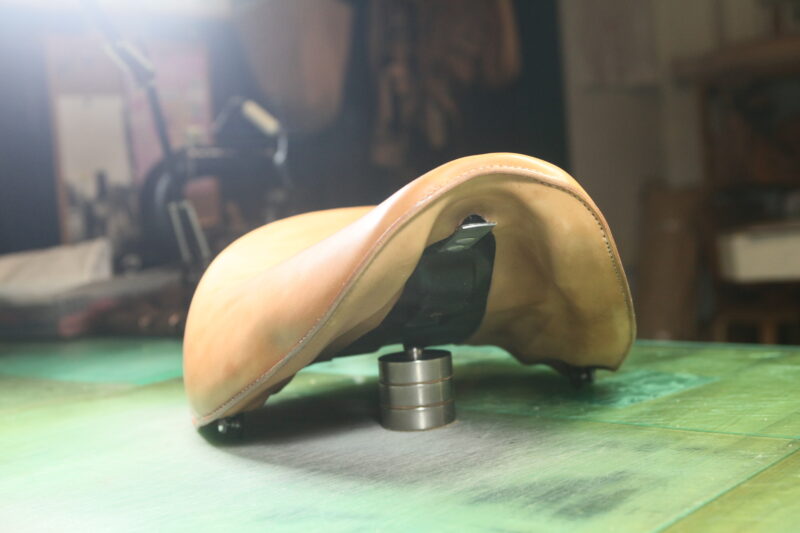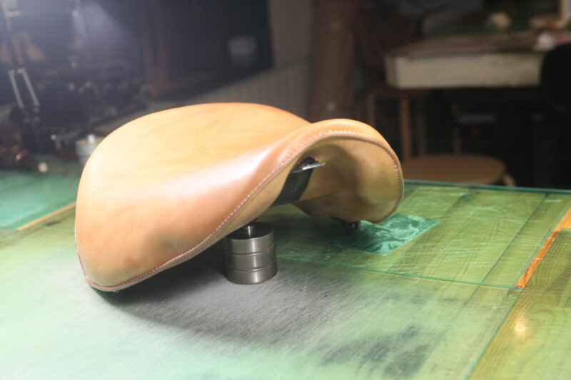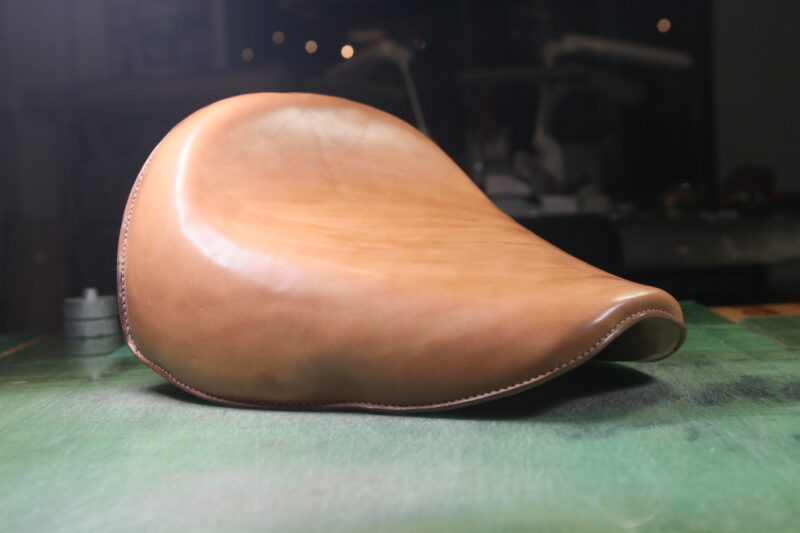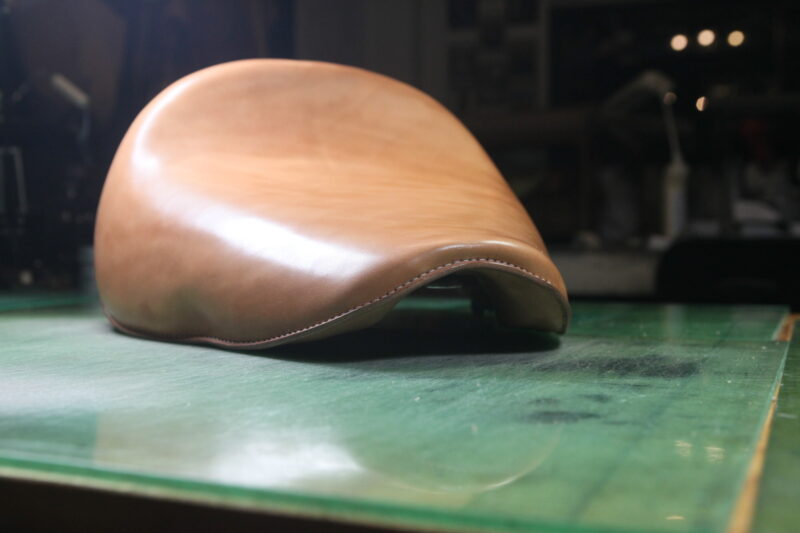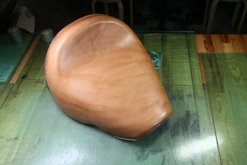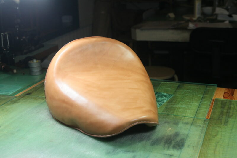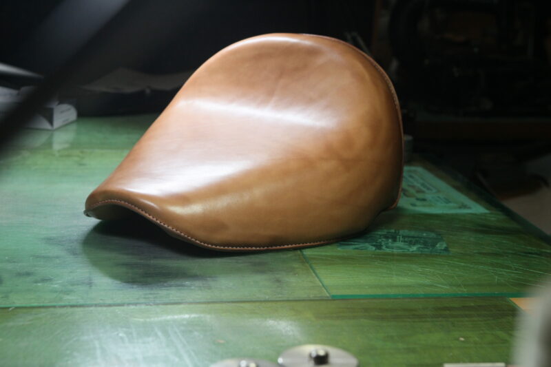 古めのショベルさんとかについてるシングルサドルシートっぽく作って欲しいとのことで、中身はそのままで見た目は古めのサドルシートっぽく包んでみました